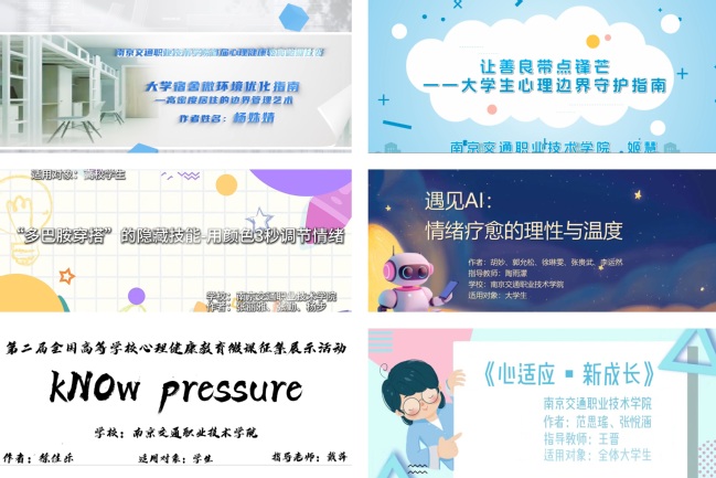 为深入贯彻江苏省教育厅心理健康宣传教育月工作部署,学院于5月全面启动“培育积极心态 增强心理韧性”心理健康教育月系列活动。创新构建“德育领航、智慧启心、体魄强基、美劳协同”四维联动机制,通过多元化活动形式构建心理健康教育长效机制,切实帮助学生以健康心态积极应对学业就业等成长挑战。