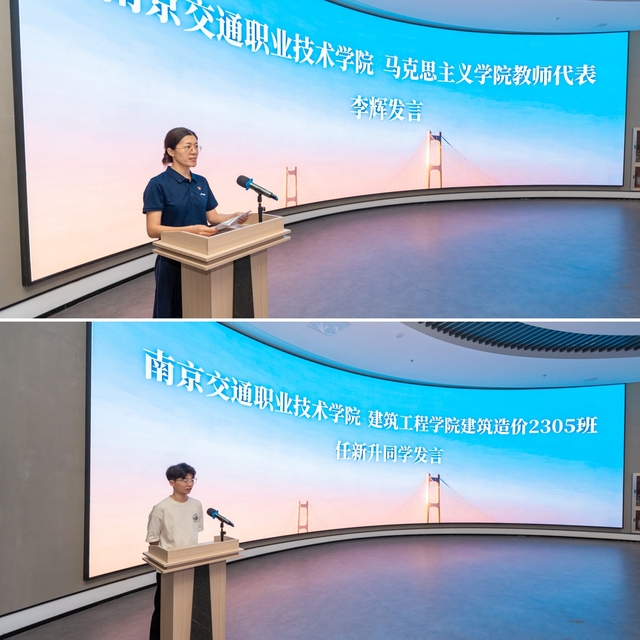马克思主义学院教师代表李辉、学生代表建筑造价2305 班任新升分别围绕“育人初心与实践构想”“交通人的成长与担当”展开交流。