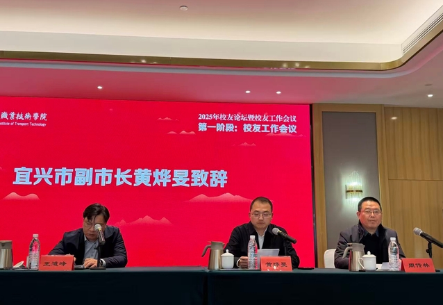 第一阶段为校友工作会议。宜兴市副市长黄烨旻致辞,向大会致以热烈祝贺。他高度肯定学院在服务区域产业升级、支撑江苏现代综合交通运输体系建设中发挥的重要作用,并希望学校进一步深化校地协同,在交通运输规划、智慧城市建设和技术人才培养等方面为宜兴提供智力支持,推动建立长期战略合作关系。
