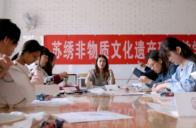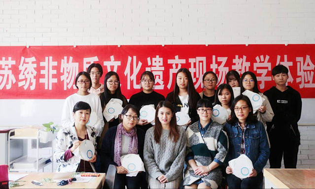 报告会后,在人文艺术系的艺术工坊开展了苏绣技艺体验活动。郁老师对艺术专业部分师生进行现场教学,学习苏绣的基本种类、针法和技巧,师生们在刺绣的同时深入体验了苏绣的魅力。