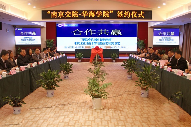 江苏华海汽车销售集团有限公司连续五年进入“中国汽车流通行业百强企业”,是南京市汽车维修行业协会会长单位,公司旗下拥有6个汽车授权品牌,16家汽车4S店、1家直营店及1家钣喷中心。新成立的“南京交院-华海学院”依据当前国家职业教育现代学徒制理念,通过学校优秀专业资源与企业优秀资源的联合,理论教学与培训实践的结合,开展“双主体育人、一体化育人”的合作模式,采用“工学交替”办学模式,实现真正意义上的德国“双元制”。“南京交院-华海学院”采用“1+0.5+0.5+1”学制组织形式,学生先在学校完成1学年文化基础和专用基础知识的学习,然后在企业进行0.5学年的专业技能培养,再回到学校进行0.5学年的专业知识学习,最后1学年在企业顶岗实习。