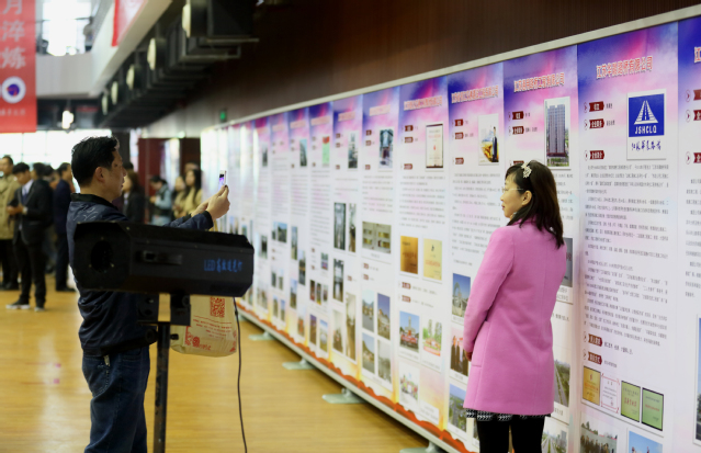 校友们在各自企业成果巡展展架前留影