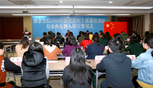11月15日下午,学院举行2018年新进教职工岗前培训班结业典礼暨入职宣誓仪式。党委书记贾俐俐出席并作专题报告。副院长王道峰主持结业典礼。组织部、人事处、教务处、科技处、学工处、教学质量管理办公室等相关职能部门和参培教师所在部门负责人参加了会议。