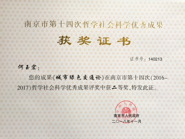 日前,南京市第十四次哲学社会科学优秀成果奖正式公布。学院何玉宏教授的成果《城市绿色交通论》(专著)获二等奖。