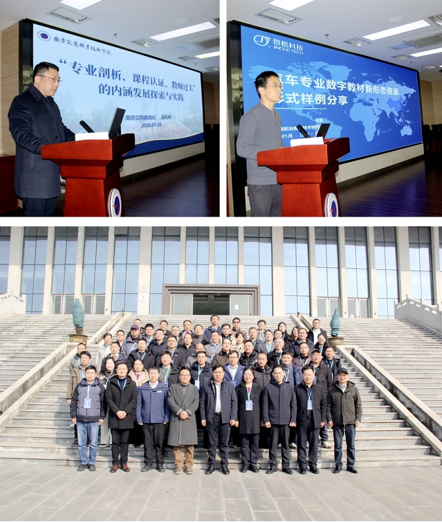 会议还设置了专家主题报告环节,学校教务处处长吴兆明围绕“‘专业剖析、课程认证、教师过关’的内涵发展探索与实践”,分享了学校在提升课堂质量工作方面的经验做法;上海景格科技有限公司总监郑丽雄,以“汽车专业数字教材及其新形态资源样例”为主题,展现了数字化技术在汽车专业教学资源建设中的应用成果。