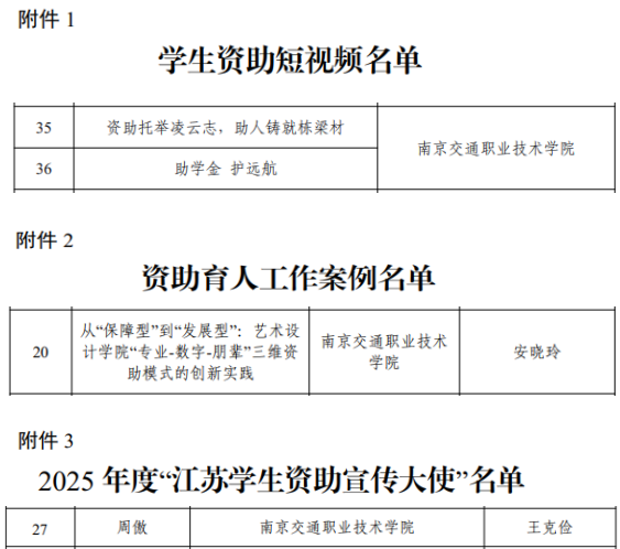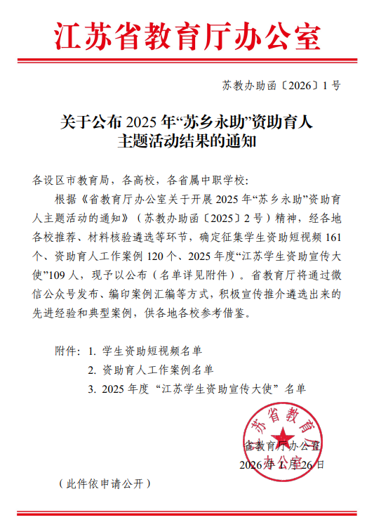 近日,江苏省教育厅办公室发布了《关于公布2025年“苏乡永助”资助育人主题活动结果的通知》(苏教办助函〔2026〕1号),我校在本次省级评选中表现优异、成果丰硕,斩获全部赛项荣誉,充分彰显了学校资助育人工作的扎实成效与鲜明特色。其中:学生工作处报送的《资助托举凌云志,助人铸就栋梁材》、轨道交通学院报送的《助学金护远航》双双入选学生资助短视频名单;艺术设计学院报送的《从“保障型”到“发展型”:艺术设计学院“专业-数字-朋辈”三维资助模式的创新实践》成功入选资助育人工作案例;轨道交通学院周傲同学光荣当选2025年度“江苏学生资助宣传大使”。