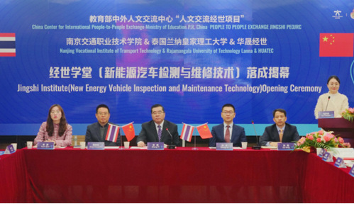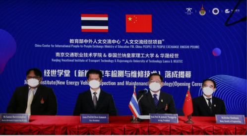 On December 23, the unveiling ceremony of Jingshi Academy (New Energy Vehicle Testing and Maintenance Technology) of Nanjing Institute of Traffic Technology -Ranna Rajabhat University of Technology, one of the “People-to-People Exchange Program” initiated by the Center for International People-to-People Exchange of the Ministry of Education,was grandly held, with the online presence of Du Kewei, director of the Center for International People-to-People Exchange (CIPE) of the Ministry of Education, Zhang Yi, president of Nanjing Institute of Traffic Technology (NJITT), Zatuli Thomplon, president of Ranna Rajabhat University of Technology (RRUT), Zhang Yu, president of Beijing Huasheng Jingshi Information Technology Co., Ltd. (Huasheng), Zhou Chuanlin, deputy Secretary of the Party Committee of NJITT.