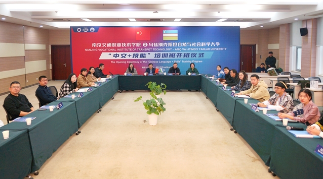 On the afternoon of December 25, the online opening ceremony of the “Chinese + Skills” training course of NJTC-UZNSS was held in the meeting room B203 of the library. Wang Daofeng, President of NJTC, and Wen Aimin, Deputy Secretary of the Party Committee; Zainadin Khudaybodiev, Director of Vocational Education Development Center of Uzbekistan, Golibujiang Botirov, Rector of the University of Natural and Social Sciences, Chen Wensheng, Director of the University, and Shakraod Khudaybodiev, Vice Rector of the University, were present at the ceremony; and Zheng Xing, Grade 3 Researcher of the Division of Foreign Affairs and Cooperative Exchanges of the Department of Education of Jiangsu Province, made a video message for the Opening Ceremony. Teachers and students of relevant colleges in China and Ukraine attended the opening ceremony in Nanjing and Tashkent respectively. The event was presided over by Wen Aimin, Deputy Secretary of Party Committee.