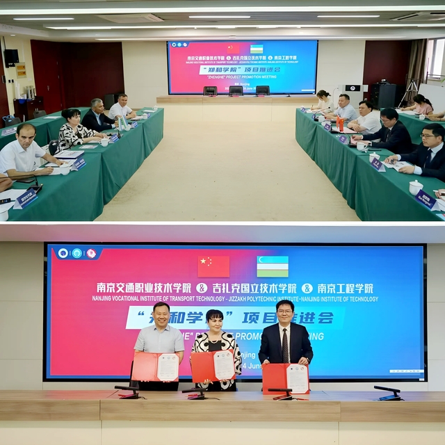 On the afternoon of the 24th, the Zhenghe College project promotion meeting of Nanjing Transportation Vocational and Technical College Jizak National Technical College Nanjing Institute of Engineering was held in Conference Room 223 of Hongyi. Dean Wang Daofeng, Vice President Eshkokova Sanobal of Jizak National Institute of Technology, and Deputy Secretary of the Party Committee of Nanjing Institute of Technology Pu Lijie attended the meeting, with Deputy Secretary of the Party Committee Wen Aimin presiding over the meeting.