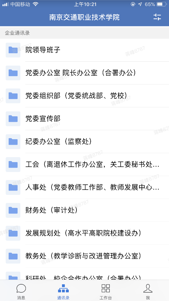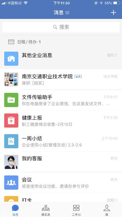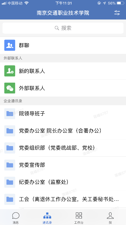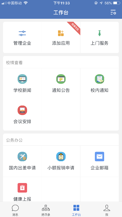 可以看到4个功能页面,通讯录里可以查找到全校教职工,方便联系;工作台中目前嵌入了学校新闻、通知公告、校内通知、会议安排,还有各类申请等,后面陆续加入功能,方便大家使用。