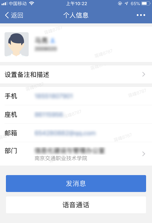 然后就能看到个人的信息,点击直接拨打电话、发邮件、微信消息,语音通话等。