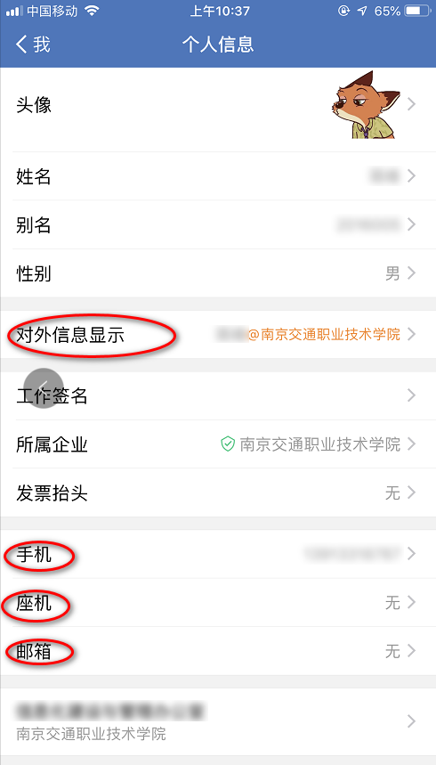 进入修改界面:目前请教职工请不要修改姓名、别名和手机号,其他的如图中所圈,可以修改。
