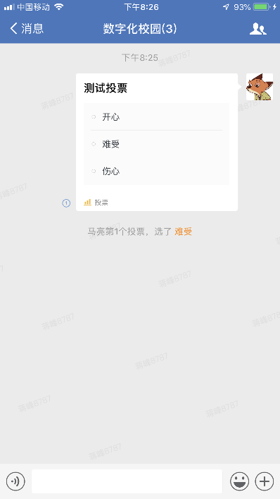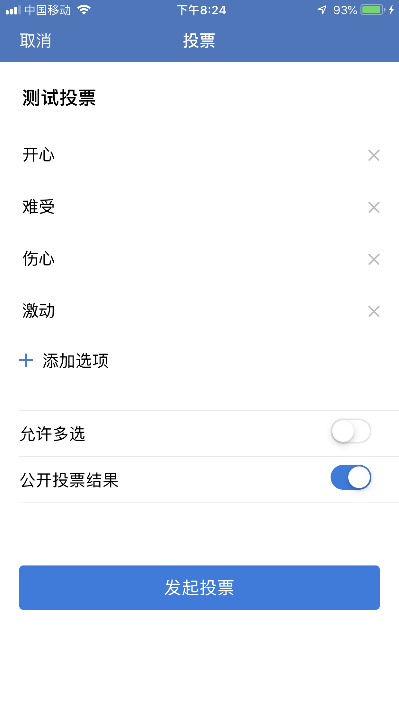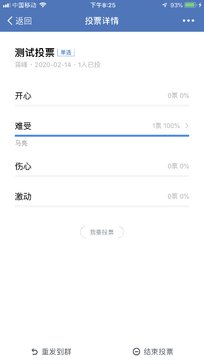 (5)“投票”:编辑投票信息,可单选、多选,发布到群消息中,群成员参与投票,界面如下: