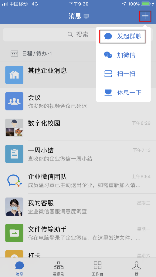 1、发起群聊,点击右上角“+”,选择“发起群聊”,