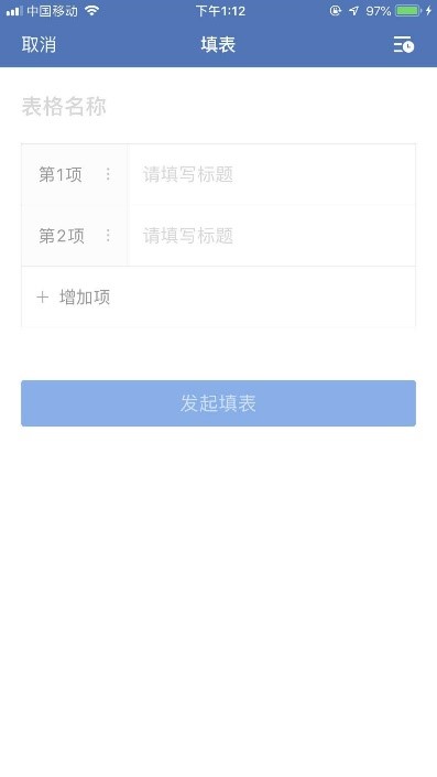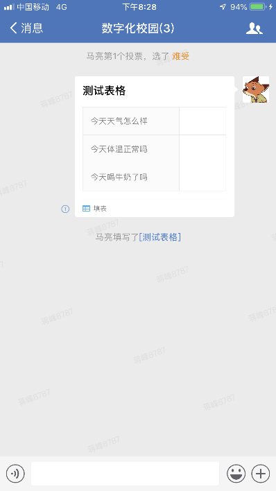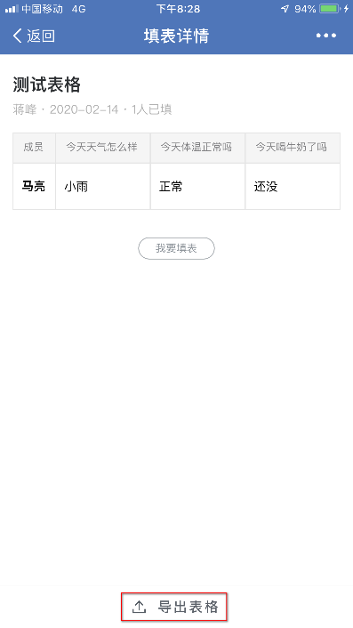 (6)“填表”:编辑表格信息,发布到群消息中,群成员参与填表统计,点击群消息中的表格消息,可查看填表详情,可导出表格信息。界面如下: