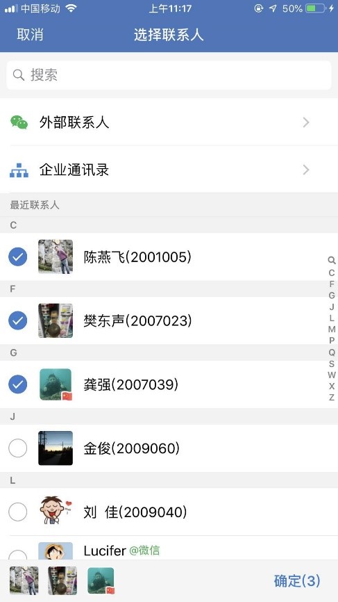进入选择联系人界面:选中想要加入群聊的人,也可以去企业通讯录里选择