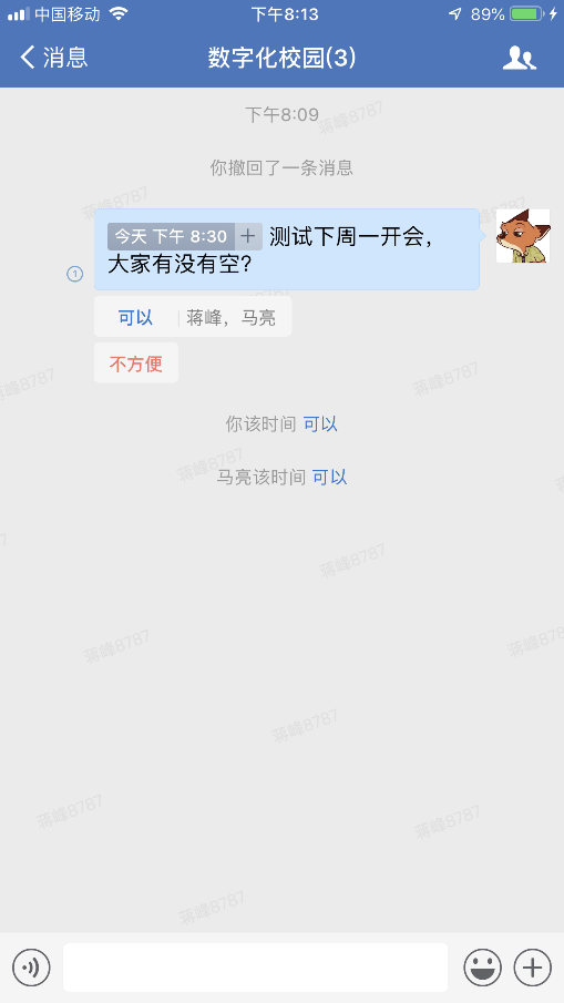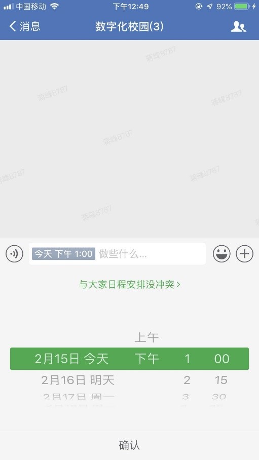 (4)“约时间”:发起一个邀约,发布邀约选择时间时,微信会自动告诉你有没有其他约时间的冲突,编辑完成,发布到群里,大家可以参与表决,如下图: