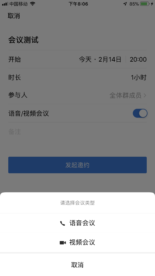 (2)“会议邀请”:填写信息,可选择语音会议或者视频会议,发起邀约