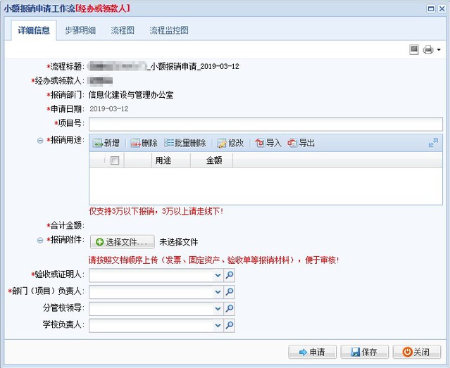 (2)流程到达财务终审时,由申请人打印小额报销审批单,附件数按实际张数手写,携附件到财务处终审报销。