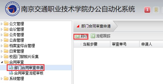1、 进入办公系统à合同审查à部门合同审查申请如图(1)所示:点击启动。