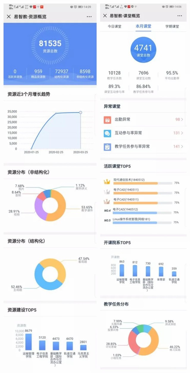 根据“线上教学”工作要求,学院推出课程教学平台,从2月10日开始,信息办工作人员连续奋战数周,完成相关后台数据准备,保障了2月24日线上开学的需求。开课一个月来,282名教师累计在教学平台上开课约773门,开设4741次课堂,建设资源81535件,确保全院7424名在校生线上课程的需要。