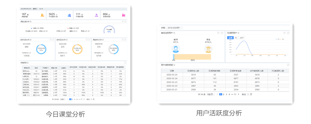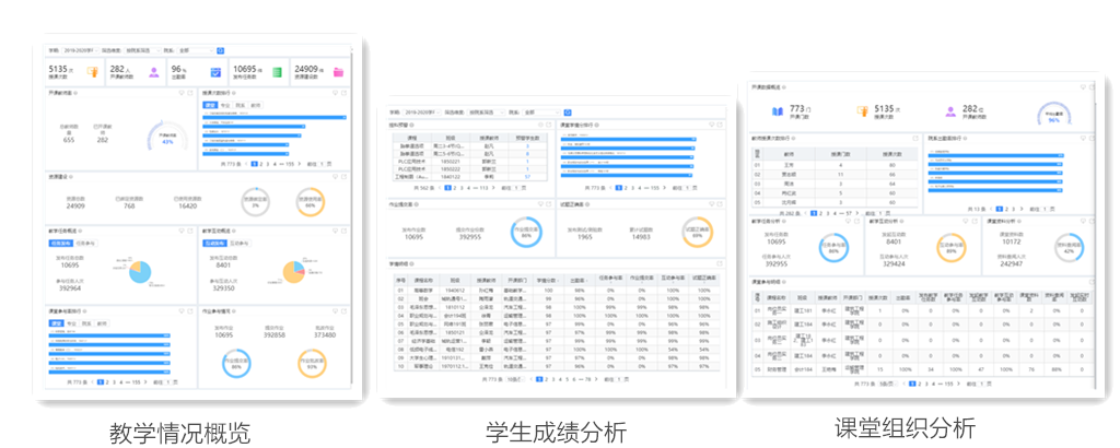 同时,为保证线上课程质量,信息办开发了线上学情分析系统,该系统能从教学情况概览、用户活跃分析、课堂组织分析、学生成绩分析以及今日课堂分析等方面为教师提供课堂教学情况反馈。