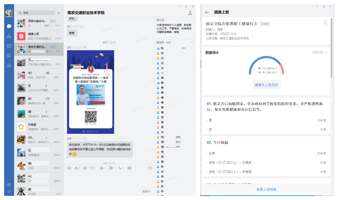 为及时采集师生健康信息,方便教职工在线办公,学院在企业微信平台上开通了官方账号,全体教职工加入统一账号,各类通知信息实现了快速“云送达”。同时,信息办还配合人事处在平台上线 “每日健康上报”应用,汇总全体教职工健康信息,有效解决了教职工疫情状态信息采集难、汇总统计工作量大的难题。