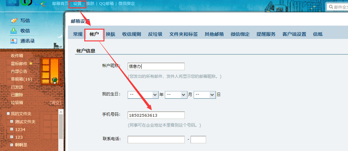 登录邮箱后,通过“设置”-“帐户”-“手机号码”,填写自己的手机号码。