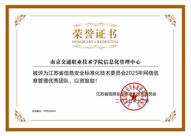 近日,江苏省信息安全标准化技术委员会正式公布2025年度评优结果,我校信息化管理中心凭借在网络安全与信息化建设领域的扎实成效与突出表现,获评“2025年网络信息管理优秀团队”,充分彰显了学校在教育数字化转型与网络安全工作中的过硬水平。